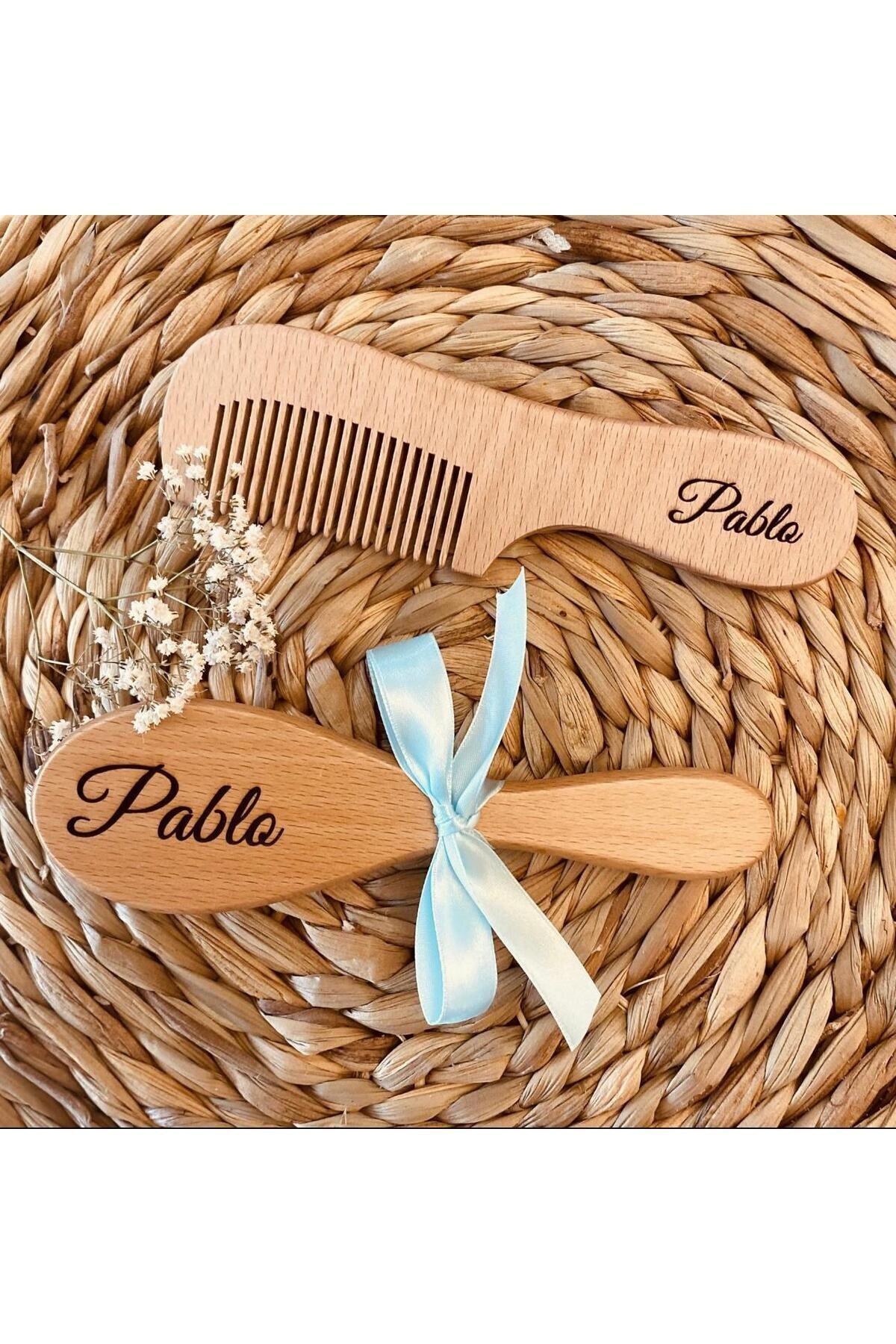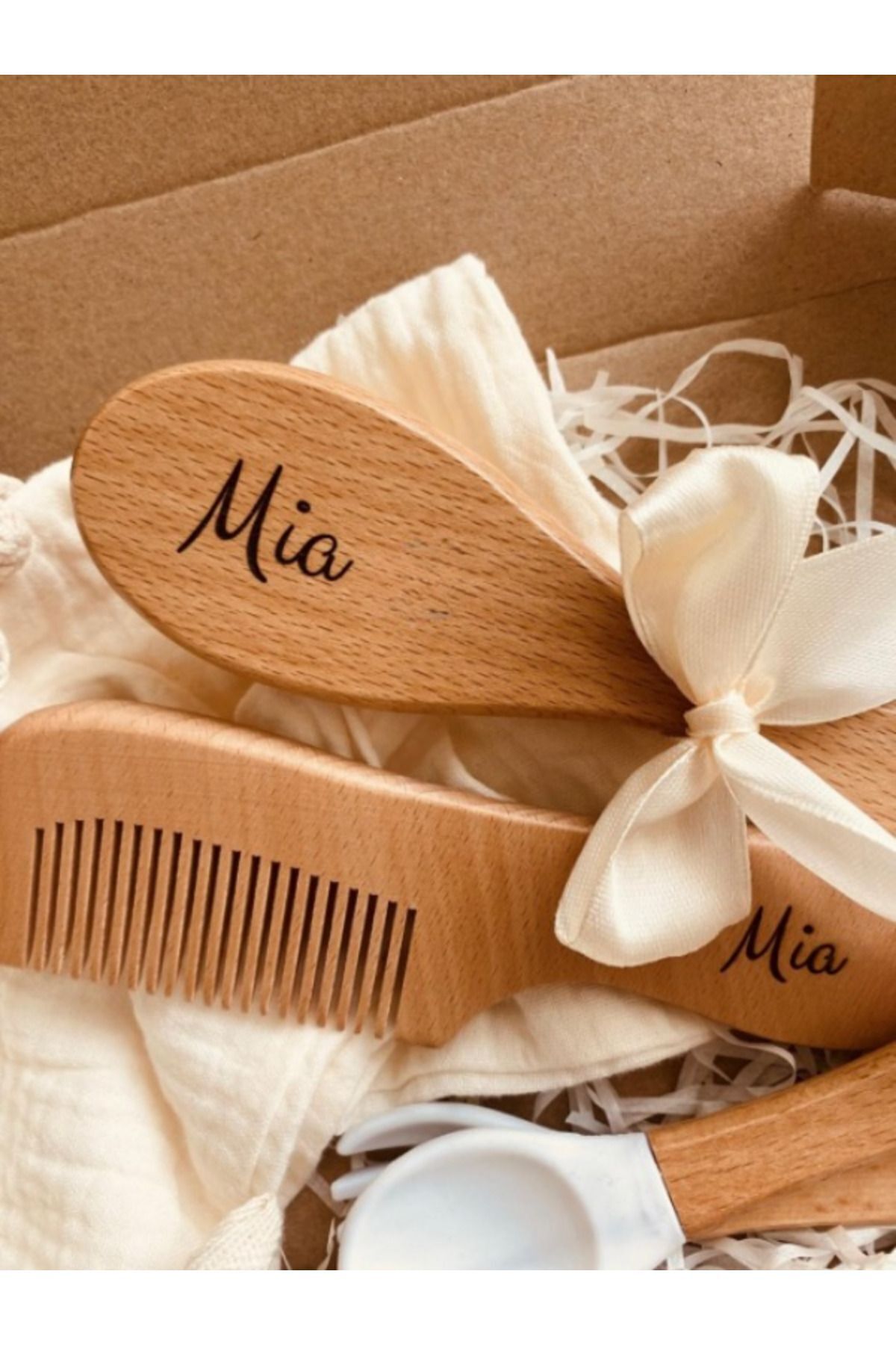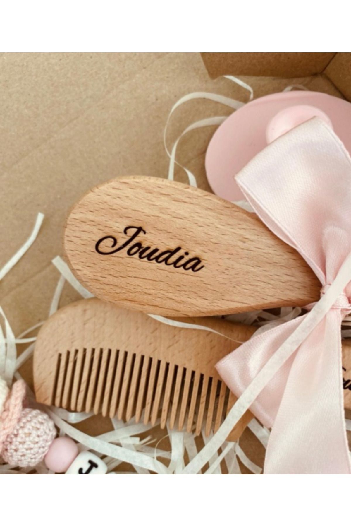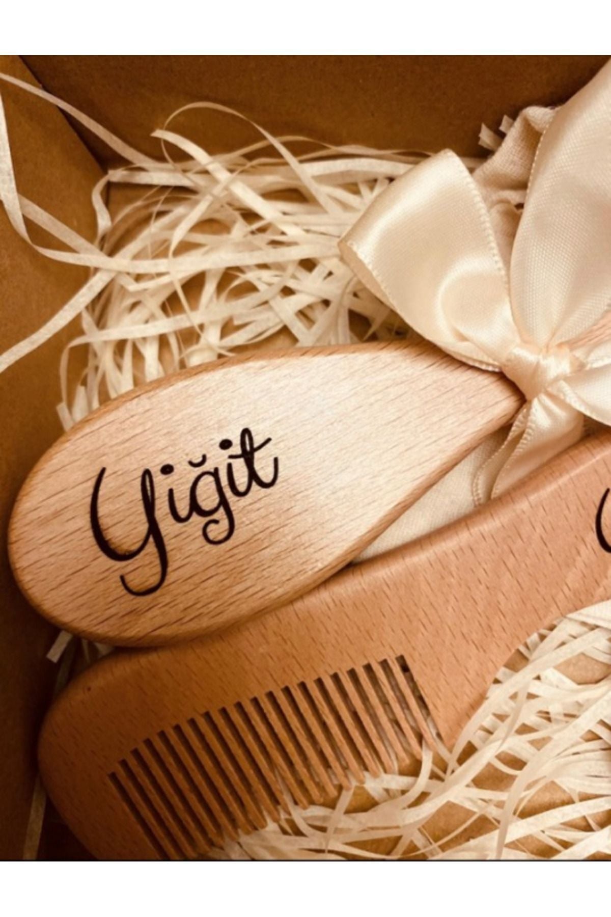 2'Li Set İSME ÖZEL DOĞAL Anne Bebek Keçı Kılı Tarak ve Saç Fırçası YENİ DOĞAN BEBEK BAKIM HEDİYELİK