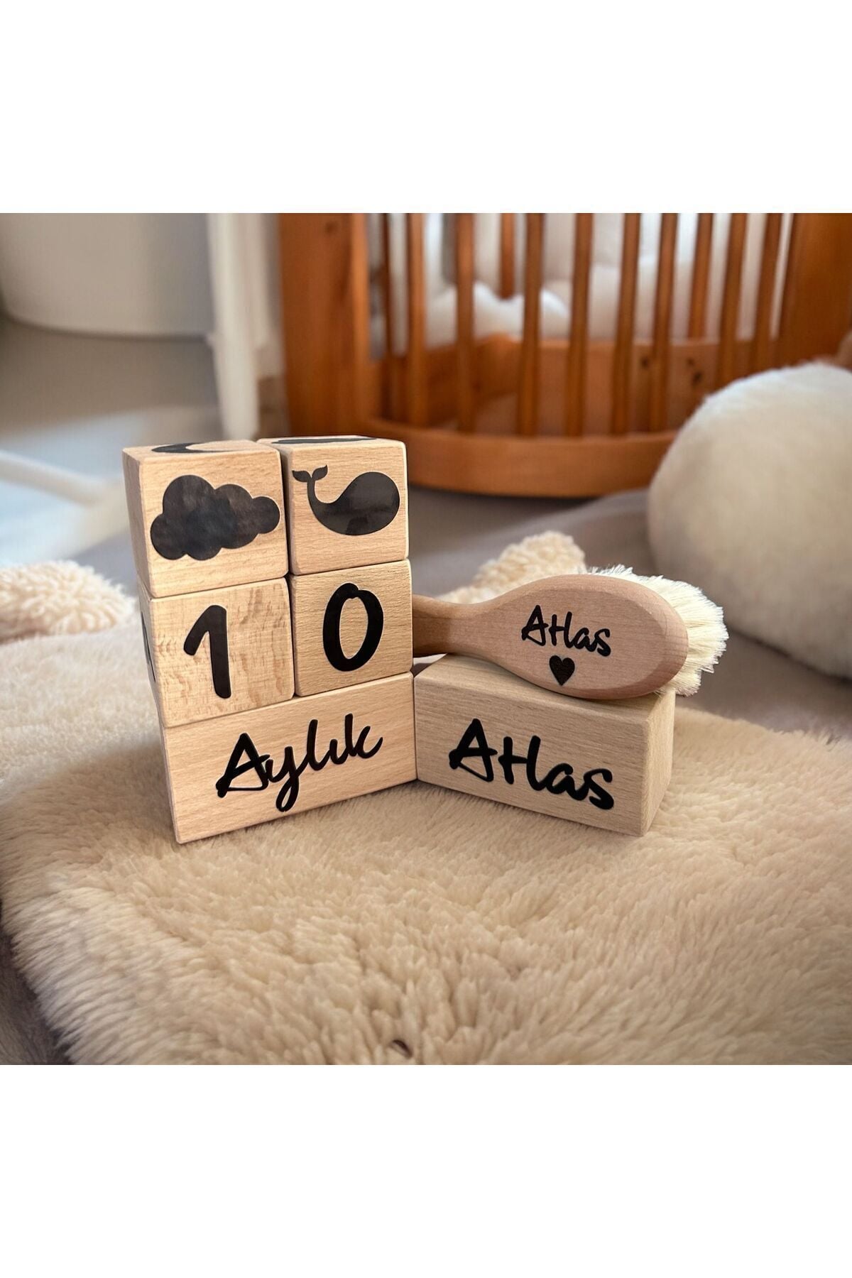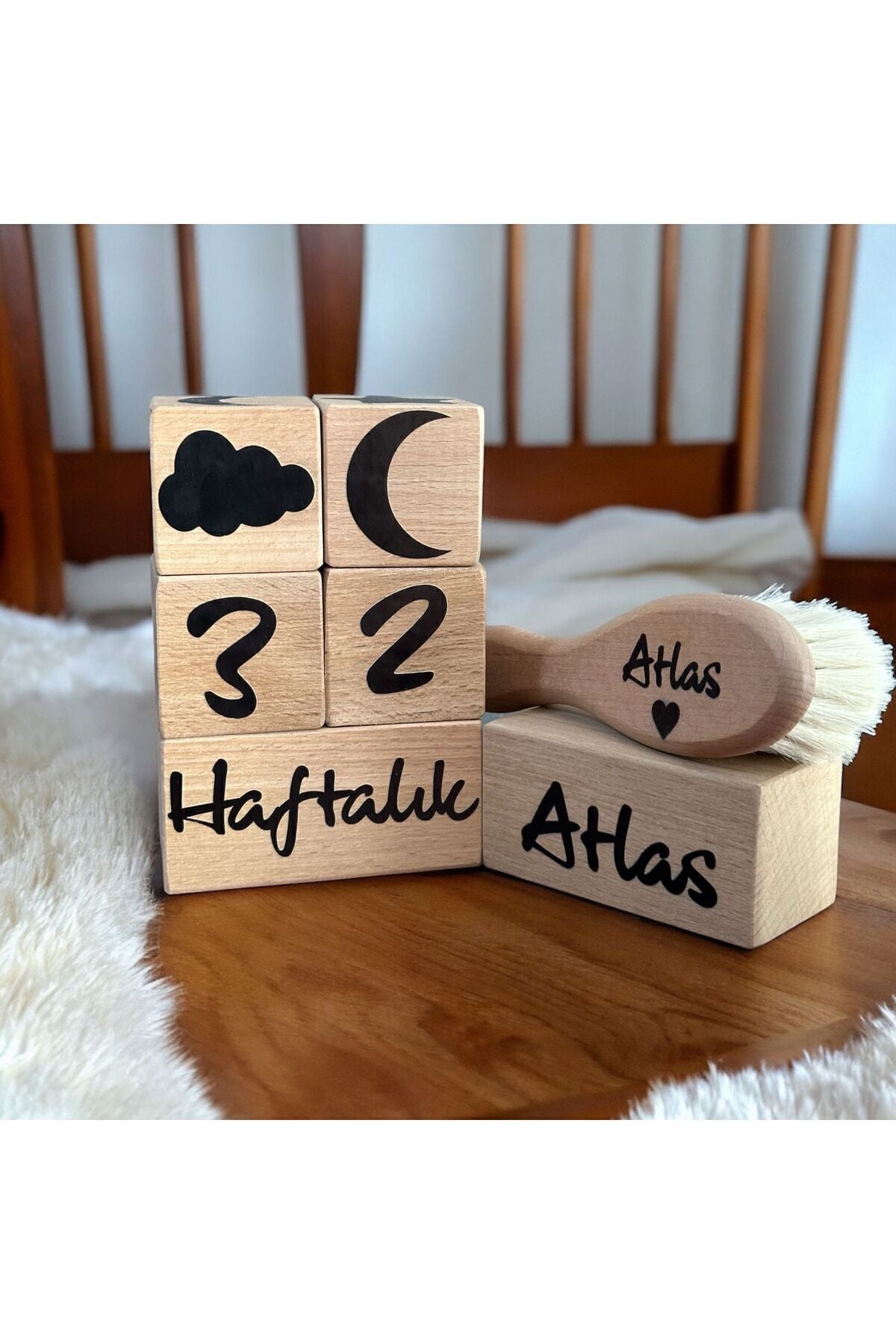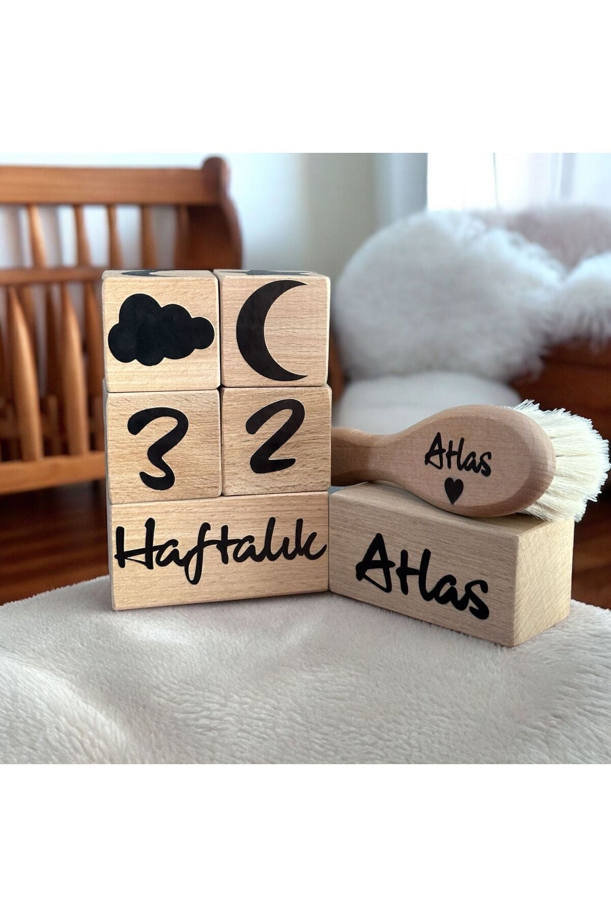 .%100 Doğal ahşaptan el işçiliği ile üretilmiştir. ; Küpler Hamilelik ve annelik sürecinde bebeğinizin ve sizin özel anılarınızı fotoğraflayanilirsiniz bebek odalarında ve ev içerisinde tarih hafta kombinleriyle dekor amaçlı kullanabilirsiniz. ; Gün,hafta,ay,yıl kombinasyonları yapabilir ayrıca doğum hamilelik hediyeleri için özel bir üründür. ; .. ; Paket içerisinde 1adet 100x50x50 ahşap prizma ve 4 adet 50x50x50 ahşap küp gelmektedir. ; 1adet bebek saç fırçasıdır fırça tamamen doğal keçı kılıdır . ; .. ; Hazırlanmasını istediğiniz ismi satıcıya sor kısmında belirtmeyi unutmayın;