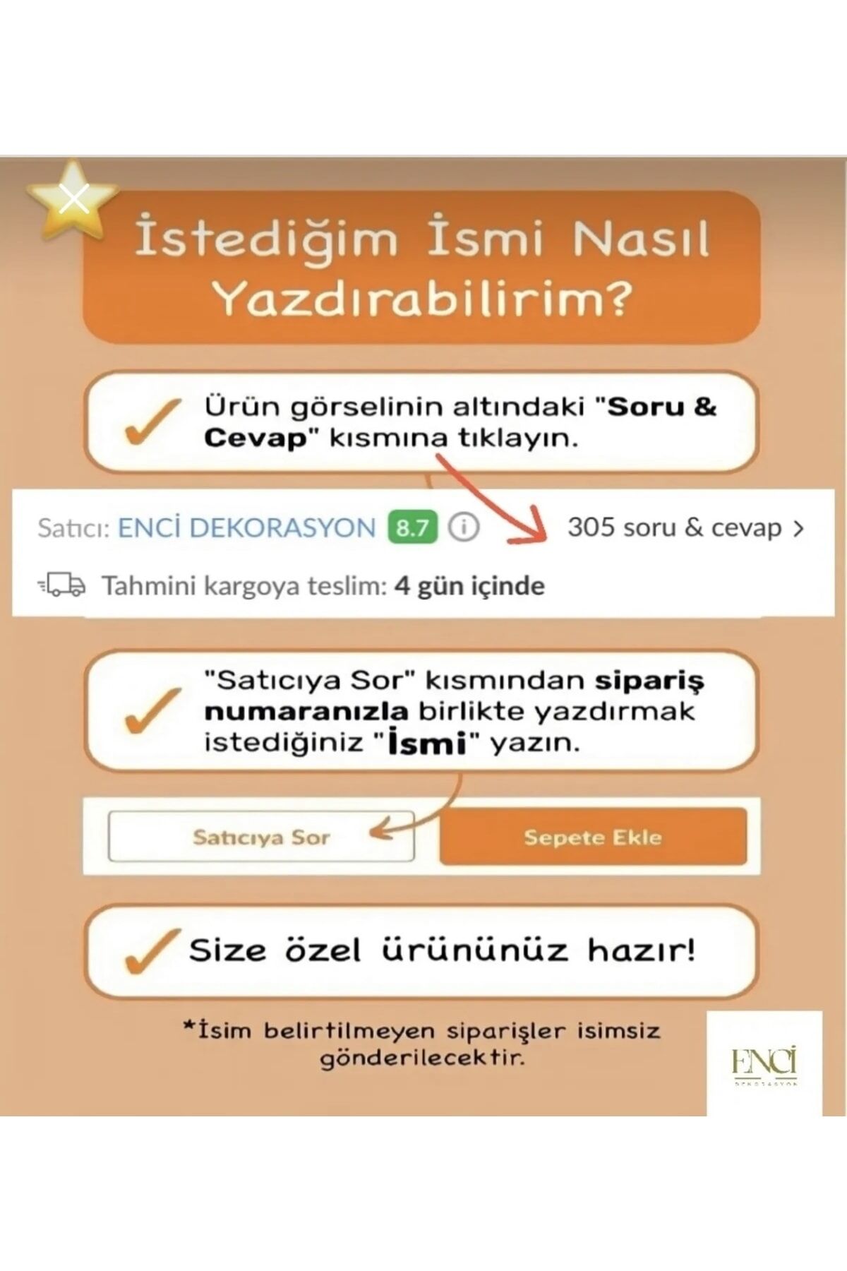 - Bebeğinizin odasına özel tasarım: Yeni doğan bebek odası duvar süsü, bebeğinizin ismine özel olarak tasarlanmıştır ve odasına kişisel bir dokunuş katar; - Sevimli ve eğlenceli tasarım: Bebek odası duvar süsü, sevimli ve eğlenceli bir tasarıma sahiptir, bebeğinizin odasını neşe ve mutlulukla doldurur; - Kaliteli malzeme: Yüksek kaliteli malzemelerden üretilmiştir, uzun ömürlü kullanım sunar ve bebeğinizin odasına şıklık katar; - Kolay montaj: Ürünün montajı kolaydır; herhangi bir ekstra araç gerektirmez ve kısa sürede kullanıma hazır hale gelir; - Bebek odası dekorasyonuna mükemmel uyum: Bebek odası duvar süsü, odanın genel dekorasyonuyla uyumlu olacak şekilde tasarlanmıştır, böylece odanın estetiğini bozmadan şıklık katar;