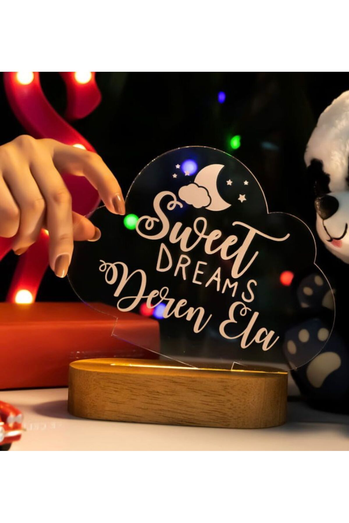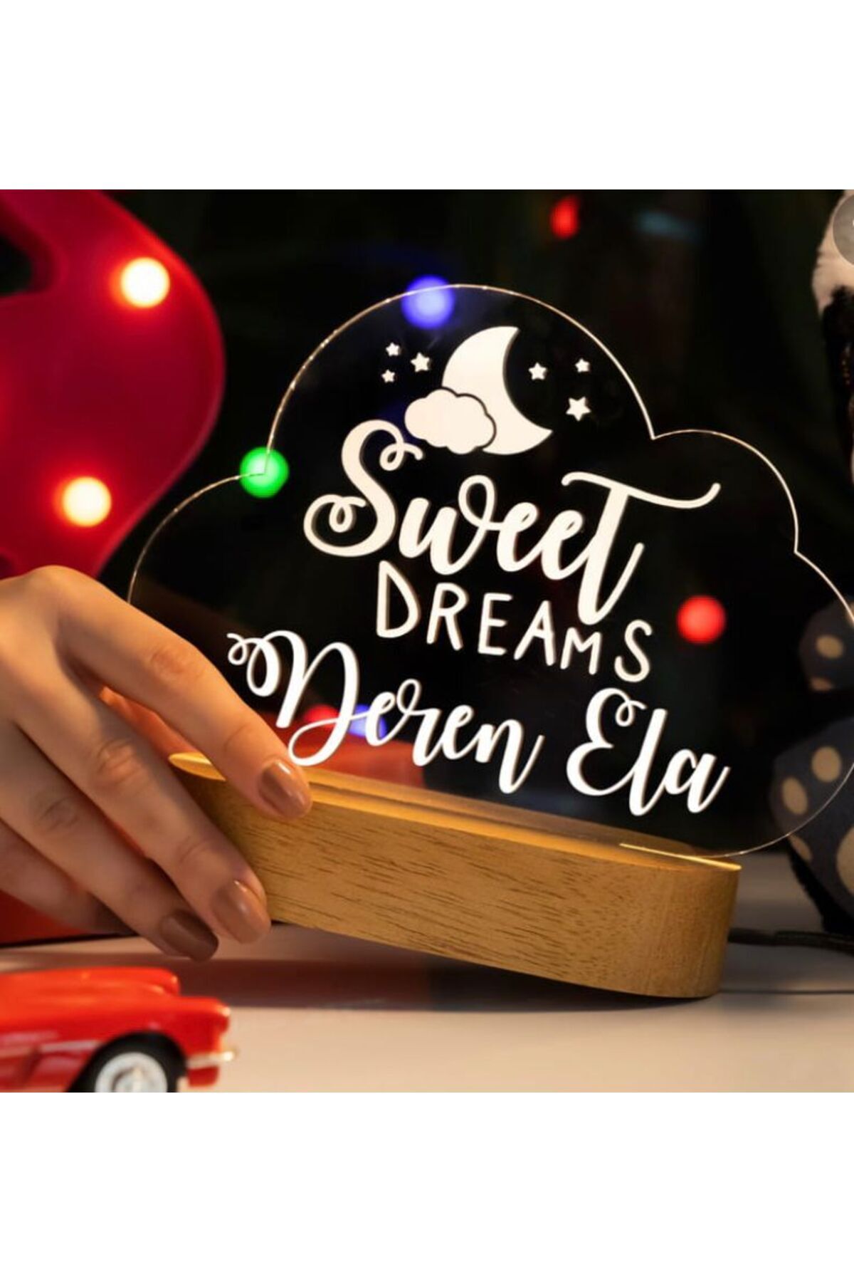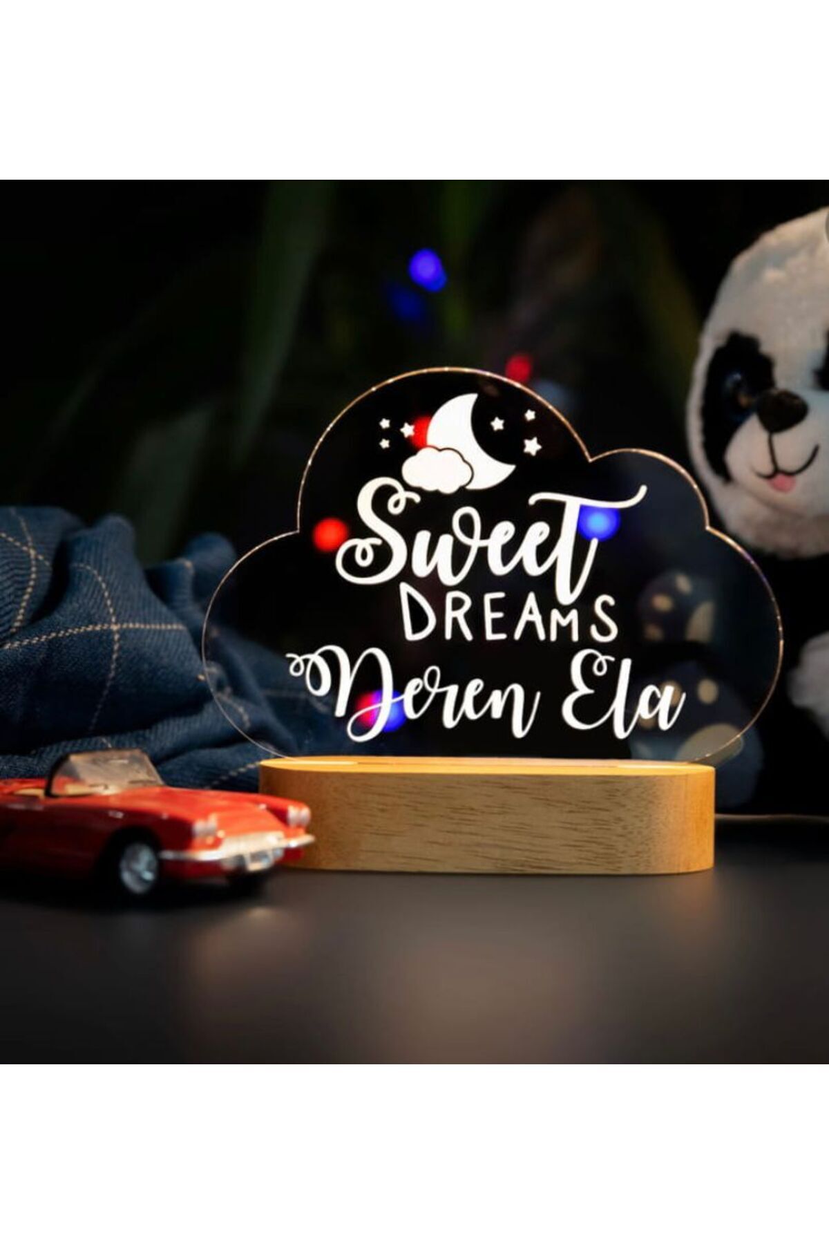 Bebeğinizin odasına sıcaklık ve huzur katan, gece lambası olarak tasarlanmış bu ürün, yeni doğan bebekler için ideal bir dekorasyondur; Özel tasarımıyla bebeğinizin odasına şıklık katarken, gece lambası olarak işlev görerek bebeğinizin rahat bir uyku ortamı sağlar; 3 farklı renk seçeneği ile bebeğinizin odasına uyum sağlayacak renklerde sunulur; böylece bebeğinizin odası her zaman canlı ve neşeli kalır; Bebeğinizin ismine özel olarak tasarlanmış bu gece lambası, ona özel bir hediye olarak da sunulabilir; böylece bebeğinizin odası tamamen ona ait olur;
