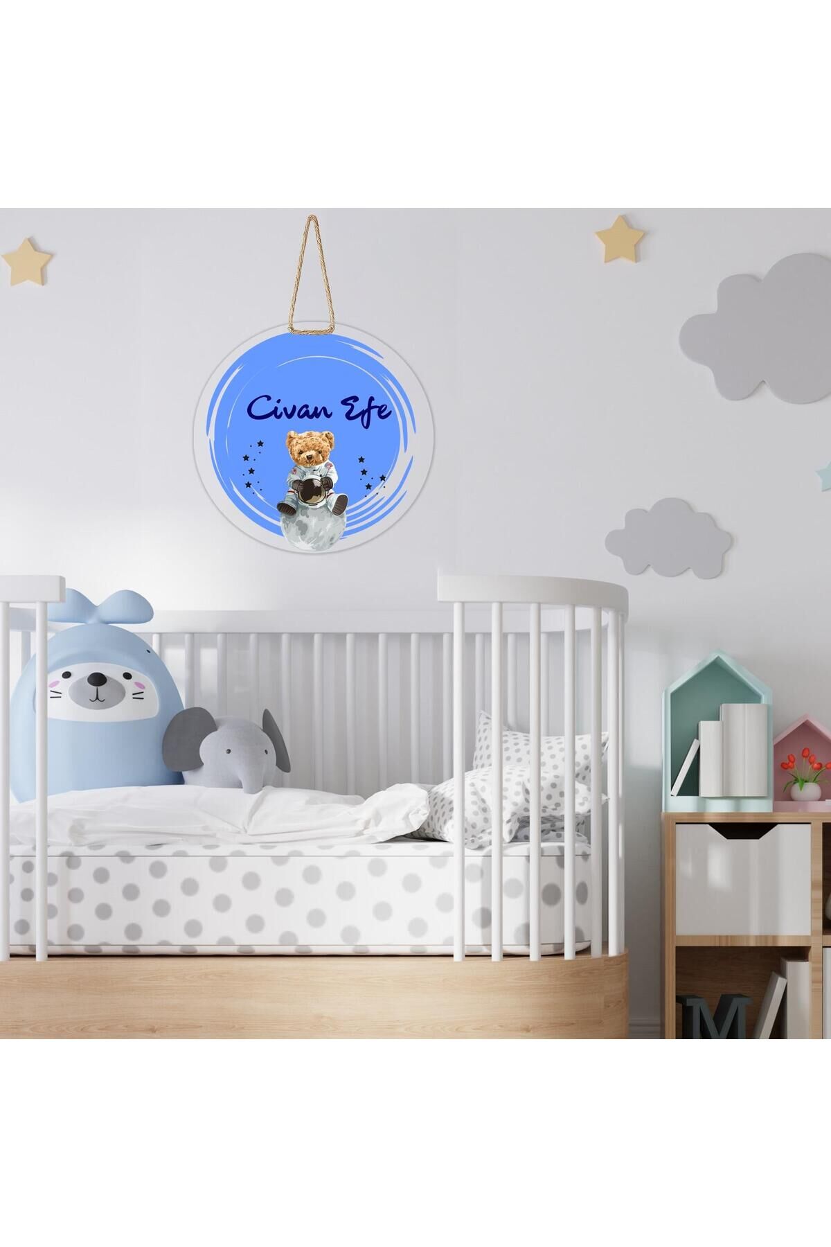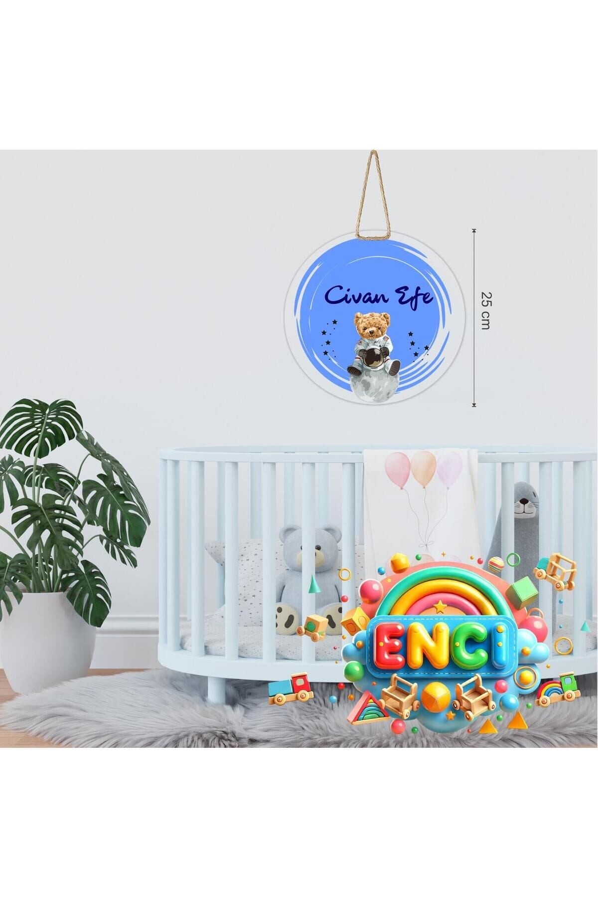 Bebeğinizin odasına sevimli ve anlamlı bir dokunuş katmak için tasarlanmış kişiye özel kapı ve duvar süsü.; Ay üzerine oturmuş ayıcık ve yıldız detaylarıyla hazırlanır, üzerine istediğiniz isim eklenerek tamamen size özel hale getirilir.; 25 cm çapındaki yuvarlak tasarımı ve doğal jüt askı ipi ile kolayca asılabilir.; Bebek odası kapısı, duvar dekoru veya fotoğraf çekimlerinde arka plan olarak kullanılabilir.; Özellikler:•Kişiye özel isim baskısı•25 cm çapında yuvarlak tasarım•Canlı renkler ve yüksek kaliteli baskı•Dayanıklı pleksi malzeme•Doğal jüt ip ile kolay asma•Bebek odası ve fotoğraf çekimleri için idealNot: Sipariş sırasında eklemek istediğiniz ismi belirtiniz.