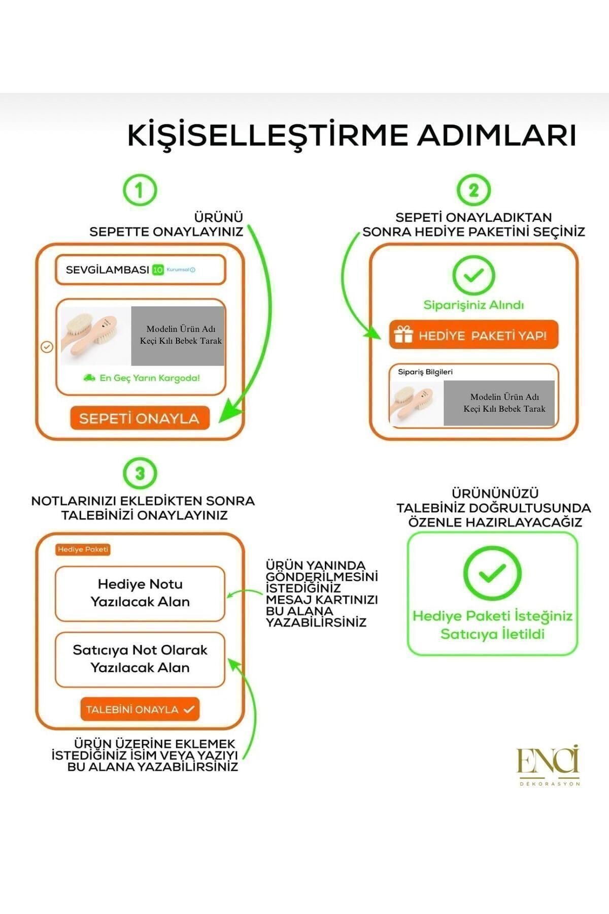 Sipariş sonrası sipariş numarası ile yazılacak ismi ürün soruları bölümünden iletmeniz gerekmektedir (isim bildirilmeyen siparişlerde isimsiz gönderilecektir ) ; bebekleriniz bu kaliteyi hak ediyor ; %100 Doğal Keçi Kılı İsime Özel Baskılı Bebek Tarağı Lazer baskı , silinmez , ürünü deforme etmez , kalıcıdır. Sağlığa bir zararı yoktur. ***sipariş sonrası yazılıcak isimi ürün sorularından sipariş numranız ile yazmanızı ricaederiz. %100 doğal keçi kılı bebek tarağı %100 doğal keçi kılı bebek saç fırçası doğal bebek saç fırçası, bebekler ve çocuklar için özel olarak üretilmiştir. Ürünümüz, hiçbir şekilde sentetik kıl içermeyen %100 doğal keçi kılından üretilmiştir. Sizler için özel tasarlanmış kutusu ile birlikte gönderilmektedir. Yeni doğan bebekler için idealdir. ; Yumuşak keçi kılı bebeğin baş derisine ; Masaj yapar, canlandırır. ; Hassas tüylerin yerinde kalmasına yardımcı olur. ; Doğal kılları, daha sağlıklı görünen bukleler için ; Saç yağını eşit şekilde dağıtır. ; Saçı ve saç derisini nazikçe fırçalamak, ; Yatmadan önce bebeğin rahatlamasına yardımcı olur. ; Düzenli fırçalama, küçükleri daha sonra ; Iyi bir saç bakımı rutinine hazırlamaya yardımcıdır. ; Bebeğinizin hassas derisine ve saçına zarar vermez. 0+ ay için kullanıma uygundur. ürünümüzde, kesinlikle hayvanlara bir zarar verilmemektedir! kullandıktan sonra nemli bir bezle temizleyip kurumaya bırakabilirsiniz. ; Bu üründen en fazla 5 adet sipariş verilebilir. 5 adetin üzerindeki siparişleri Trendyol iptal etme hakkını saklı tutar. ; ; Listelenen fiyat 14 Kasım 2022 tarihine kadar geçerlidir. ;